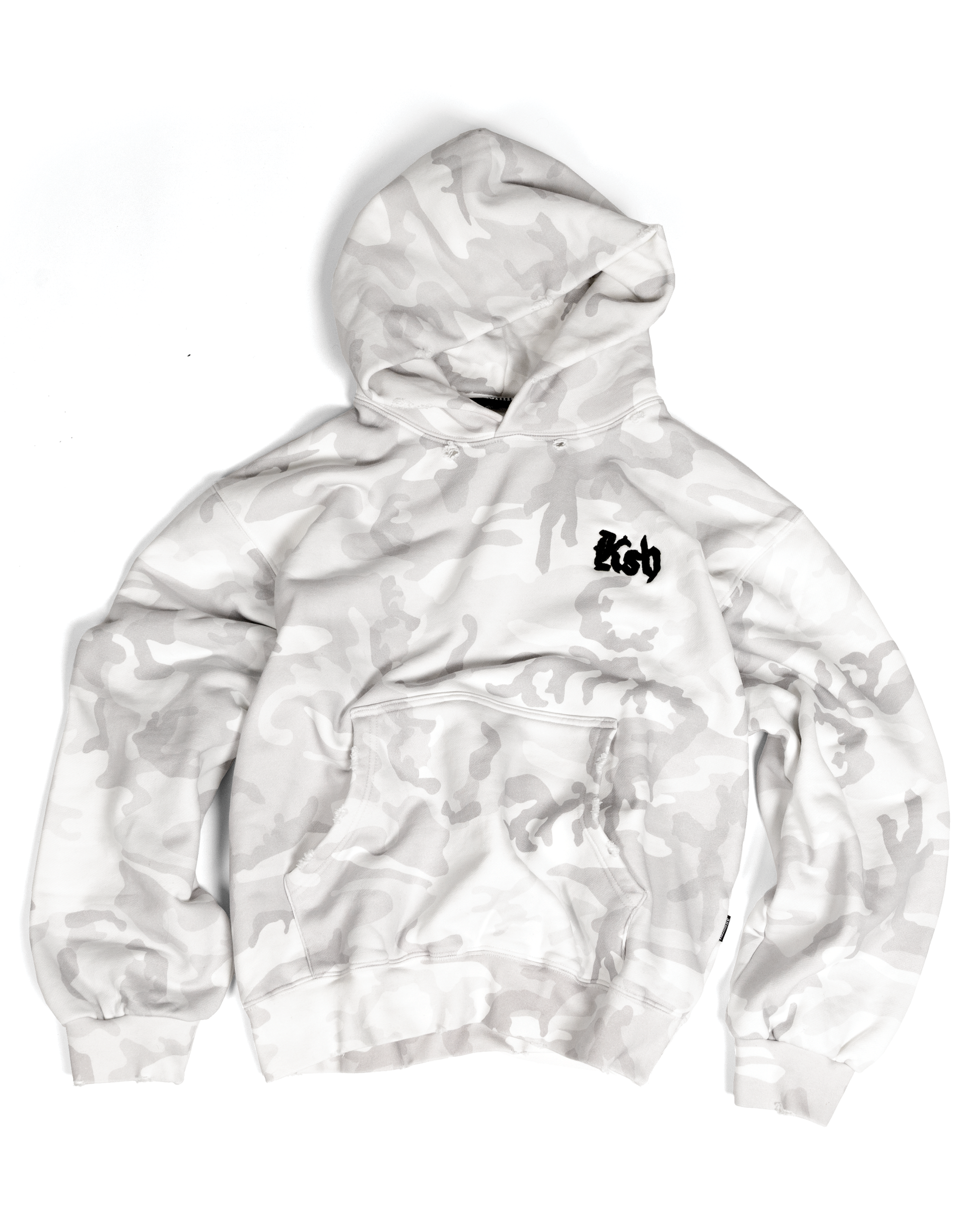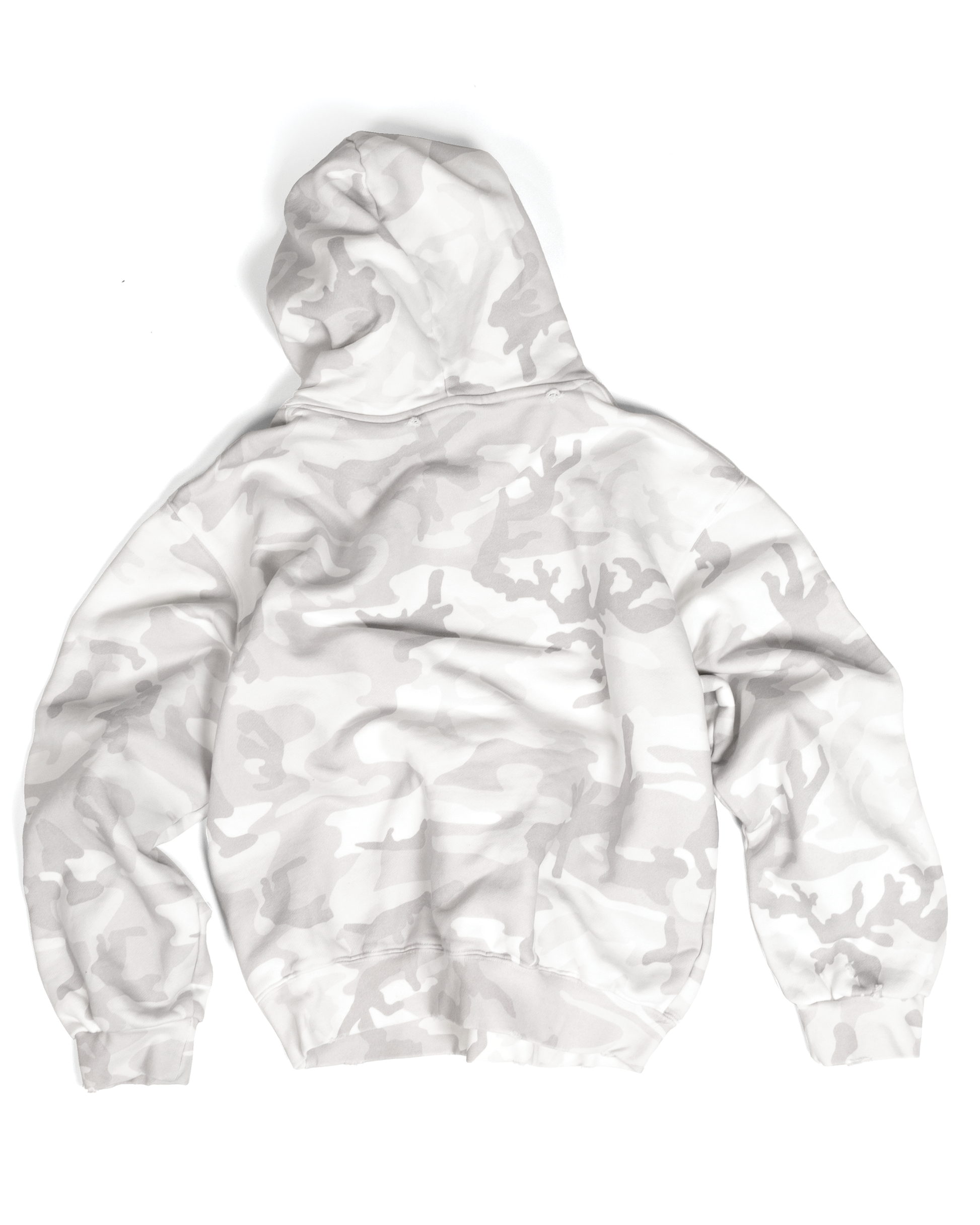 All over printed hoodie with an M81 Woodland faded urban camo pattern & a black chain stitch embroidery on the chest